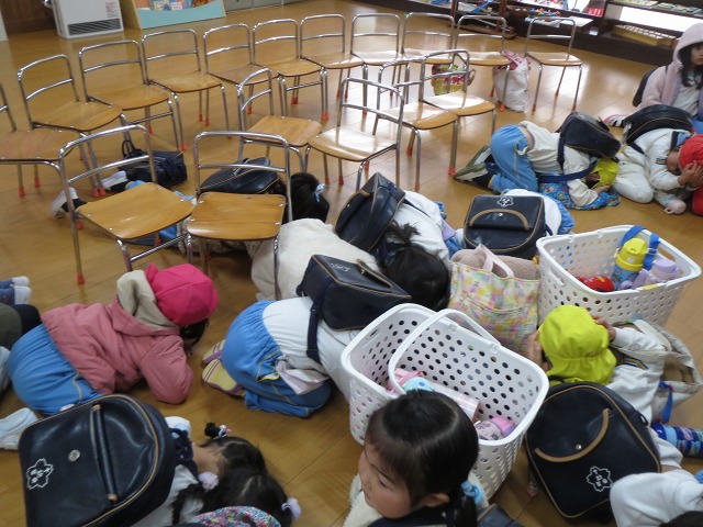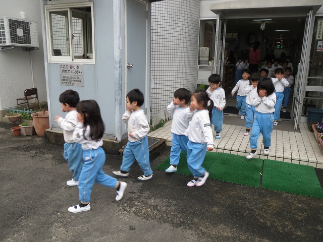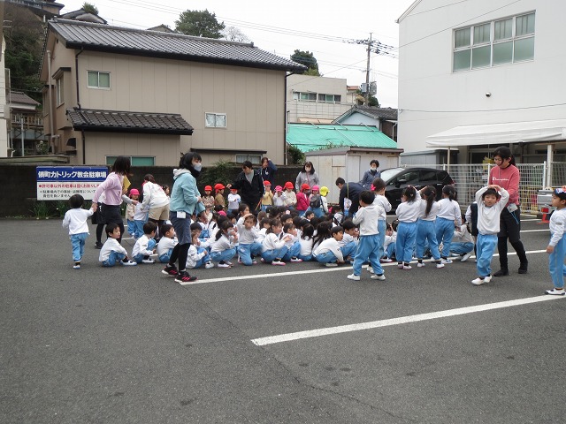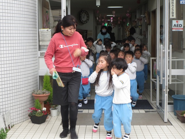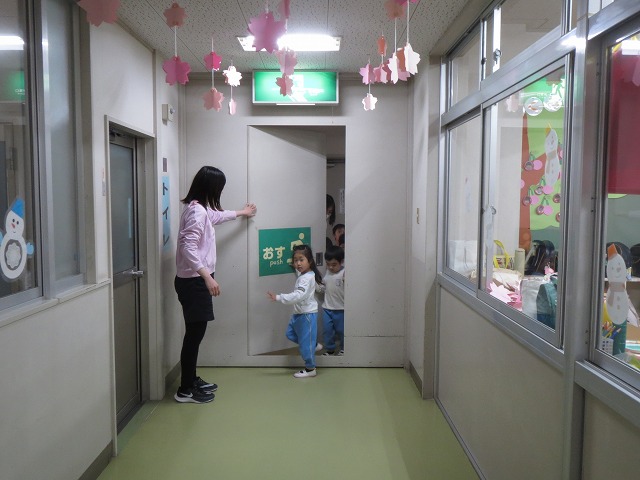 投稿日: 2024年2月24日 投稿者: 桜の聖母 佐世保避難訓練 2月22日(木) 地震による火災を想定した避難訓練を行いました。 非常ベルの音に驚いているお友だちもいましたが、 放送をしっかり聞いて、皆で安全な場所へ避難することができました。 避難した後は園長先生のお話を聞いて、避難する時の約束事を再確認しました。 「お・は・な・し」のお約束、みんな真剣に聞いていましたよ(*^_^*) 防火扉も上手に通ることができました☆