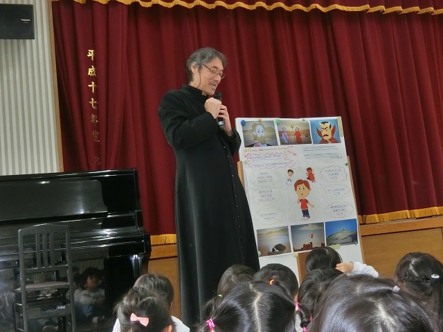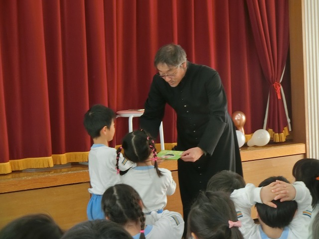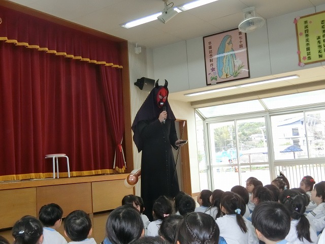 投稿日: 2024年3月2日 投稿者: 桜の聖母 佐世保神父様の話 2月26日(月)に神父様の話がありました。 神父様は、悪魔の役になって登場☆ 「人は、パンだけで生きるのではありません。神さまのこころを生きることが大事なのです」 これは、聖書(マタイ4章4節より)に基づいて、私たちの心の中にいる“わがまま”や“自分勝手”の心を見直しましょう…と話がありました。 神父さまの話を子どもたちは真剣に聞きましたよ! これからも、周りの人を大切にすることや嘘をついたり人のせいにしない 素直な心を持ち続けましょう(*^^*)