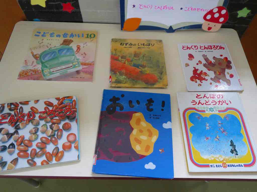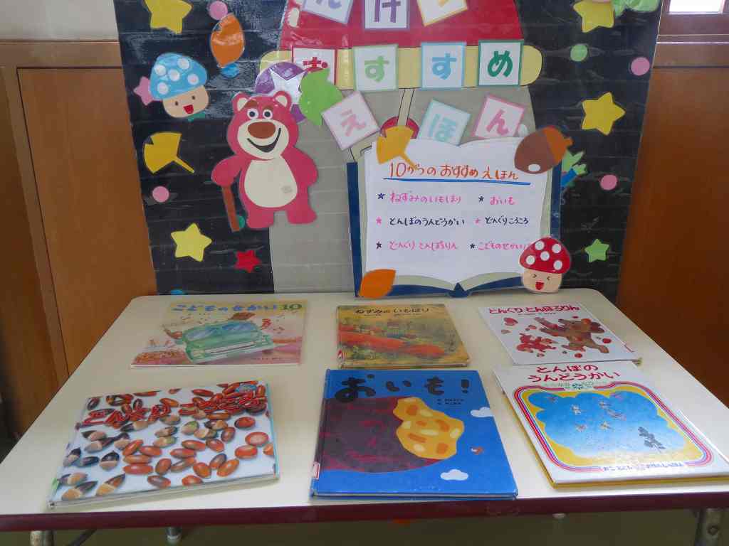投稿日: 2025年9月27日 投稿者: 桜の聖母 佐世保10月のおすすめ絵本 図書室前にある「今月のおすすめ絵本」コーナーの紹介です。 「とんぼのうんどうかい」 「どんぐり とんぽろりん」 「ねずみの いもほり」 「おいも!」 「どんぐり ころころ」 「こどものせかい10」 読書の秋!家族で絵本の世界を楽しんで見られませんか?