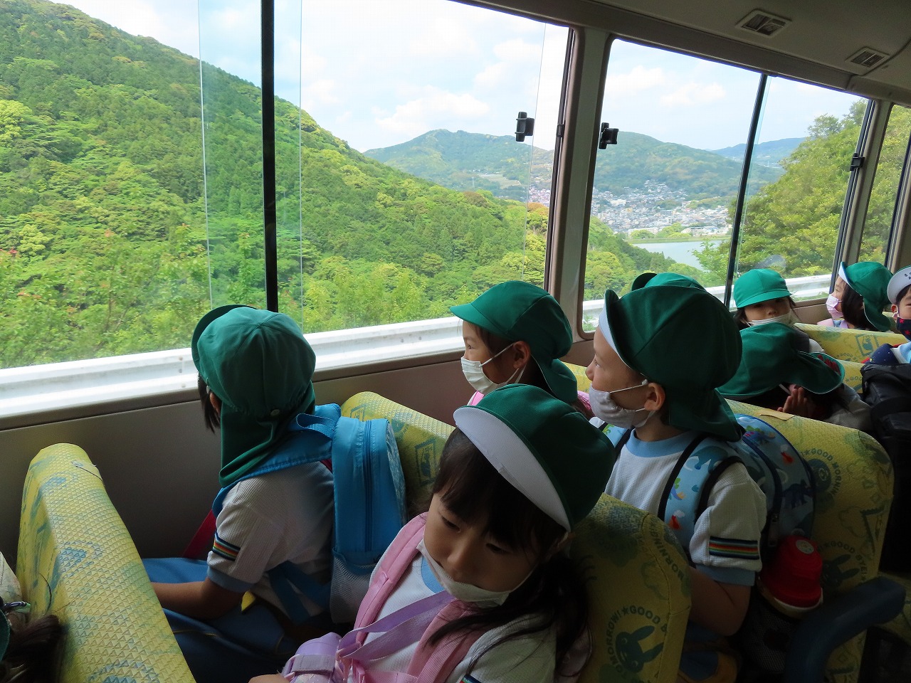 見慣れた街並みから、森へ山へと風景が変わってくると、窓の外を見て子どもたちも大喜び!