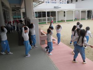 避難訓練がある事を知らなかったので、少しドキドキしていた子どもたちでしたが、