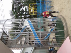 その後みんなで避難用の滑り台を滑る練習をしたり、防火扉を通ったり