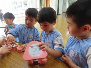 正しい歯磨きの仕方を模型を使って学びましたよ☆